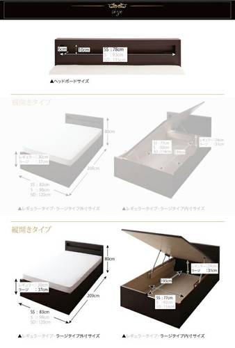本体最大外寸<レギュラー・ラージ共通縦型>セミシングル:(約)209×83×80cmシングル:(約)209×98×80cmセミダブル:(約)209×120×80cm<レギュラー・ラージ共通横型>セミシングル:(約)208×82×80cmシングル:(約)208×98×80cmセミダブル:(約)208×120×80cm床から床面までの高さ<レギュラー>全サイズ共通:(約) 30cm<ラージ>全サイズ共通:(約) 37cm収納部有効内寸<レギュラー・縦型>セミシングル:(約)193×77×24cmシングル:(約)193×92×24cmセミダブル:(約)193×114×24cm<レギュラー・横型>セミシングル:(約)189×77×24cmシングル:(約)189×92×24cmセミダブル:(約)189×114×24cm<ラージ・縦型>セミシングル:(約)193×77×31cmシングル:(約)193×92×31cmセミダブル:(約)193×114×31cm<ラージ・横型>セミシングル:(約)189×77×31cmシングル:(約)189×92×31cmセミダブル:(約)189×114×31cm【材質】プリント化粧繊維板【生産国】日本【カラー】ダークブラウン/ホワイト/ナチュラル【耐荷重】全サイズ共通:(約)180kg【重量】<レギュラー・縦型>セミシングル:(約)73kgシングル:(約) 83kgセミダブル:(約)93kg<レギュラー・横型>セミシングル:(約)68kgシングル:(約) 78kgセミダブル:(約)88kg<ラージ・縦型>セミシングル:(約)75kgシングル:(約) 85kgセミダブル:(約) 95kg<ラージ・横型>セミシングル:(約)70kgシングル:(約) 80kgセミダブル:(約) 90kg【梱包サイズ】<レギュラー・縦型>セミシングル:(約)88×11×83cm・12kg/84×4×31cm・2 kg/85×198×8cm・31kg/28×195×20cm・32kgシングル:(約)100×11×83cm・13kg/98×4×31cm・2 kg/100×198×8cm・36kg/28×195×20cm・32kgセミダブル:(約)123×11×83cm・16kg/120×4×31cm・2 kg/121×198×8cm・41kg/28×195×20cm・32kg<レギュラー・横型>セミシングル:(約)88×11×83cm・12kg/84×4×31cm・2 kg/88×190×8cm・22kg/84×28×20cm・3kg/190×28×8cm・16kgシングル:(約)100×11×83cm・13kg/98×4×31cm・2 kg/100×190×8cm・25kg/98×28×20cm・4kg/190×28×8cm・16kgセミダブル:(約)123×11×83cm・16kg/120×4×31cm・3 kg/121×190×8cm・ 29kg/ 120×28×20cm・5kg/190×28×8cm・16kg<ラージ・縦型>セミシングル:(約)88×11×83cm・12kg/84×4×31cm・2kg/ 85×198×8cm・31kg/35×195×20cm・32kgシングル:(約)100×11×83cm・13kg/98×4×31cm・2 kg/100×198×8cm・36kg/35×195×20cm・32kgセミダブル:(約)123×11×83cm・16kg/120×4×31cm・2 kg/121×198×8cm・ 41kg/35×195×20cm・32kg<ラージ・横型>セミシングル:(約)88×11×83cm・12kg/84×4×31cm・2 kg/88×190×8cm・22kg/88×47×20cm・4kg/190×35×8cm・18kgシングル:(約)100×11×83cm・13kg/98×4×31cm・ 2 kg/100×190×8cm・25kg/98×28×20cm・4kg/190×35×8cm・18kgセミダブル:(約)123×11×83cm・16kg/120×4×31cm・3kg/121×190×8cm・29kg/120×28×20cm・5kg/190×35×8cm・16kg※本製品は、組み立て品です。