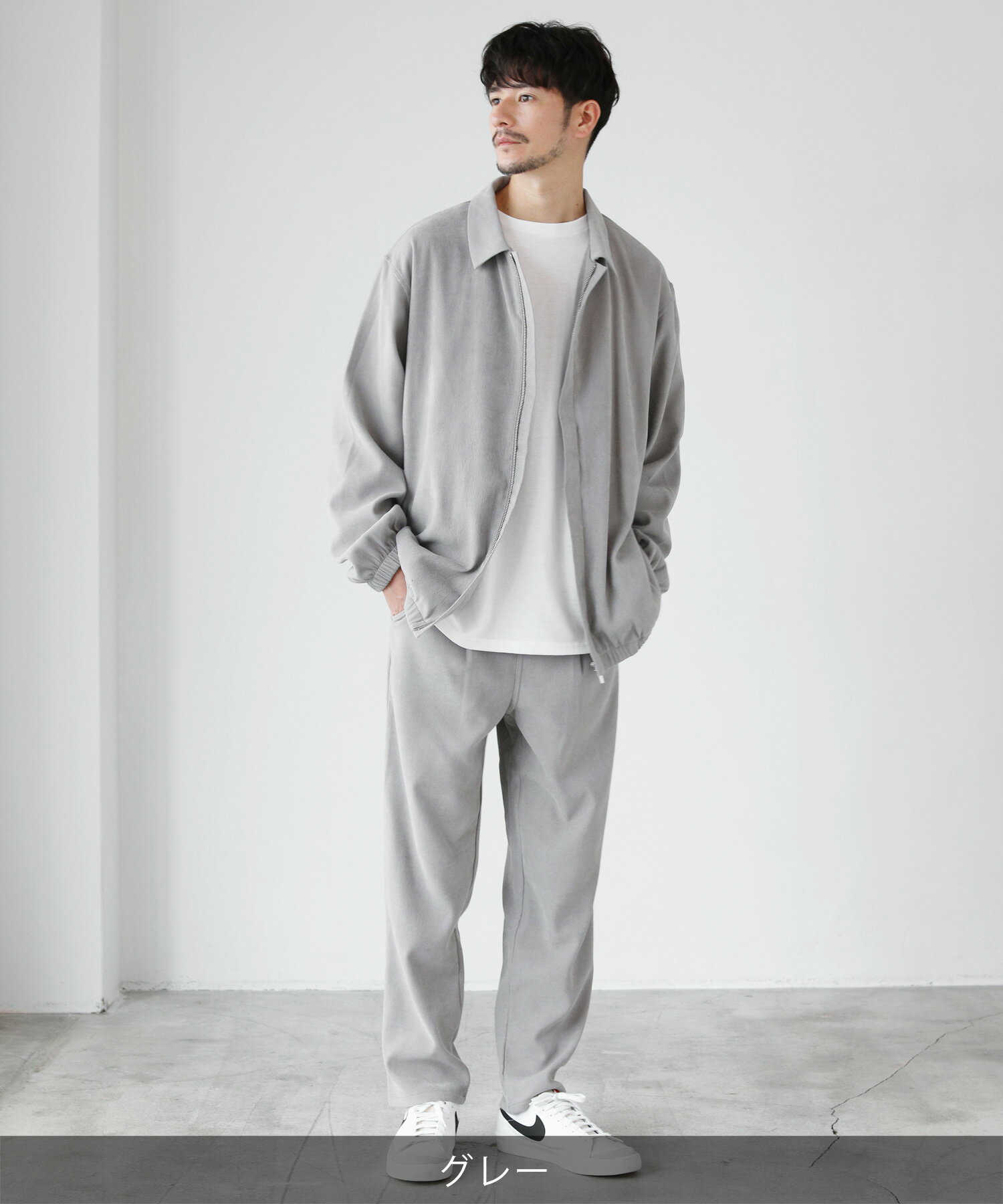 ▼素材 【ブルゾン/パンツ】ポリエステル:100% 【カットソー】ポリエステル:80% 綿:20% ▼商品詳細 透け感:なし 裏地:なし 光沢:わずかにあり 生地の厚さ:普通 伸縮性:あり ※完売カラーのお知らせ商品細部写真に使用している『チャコール』は完売いたしました。
