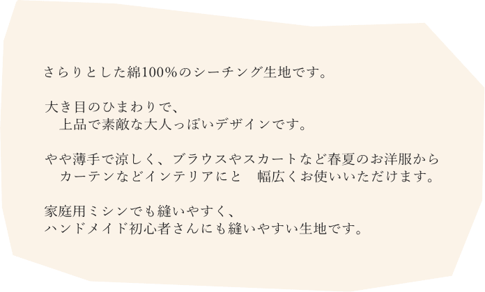 素材綿 100% 生地巾約108cm巾(110巾) 生地の種類シーチング 生地の厚みやや薄手 産地日本製 ミシン針11号 ミシン糸60番手 ◆価格は10cmあたりです。