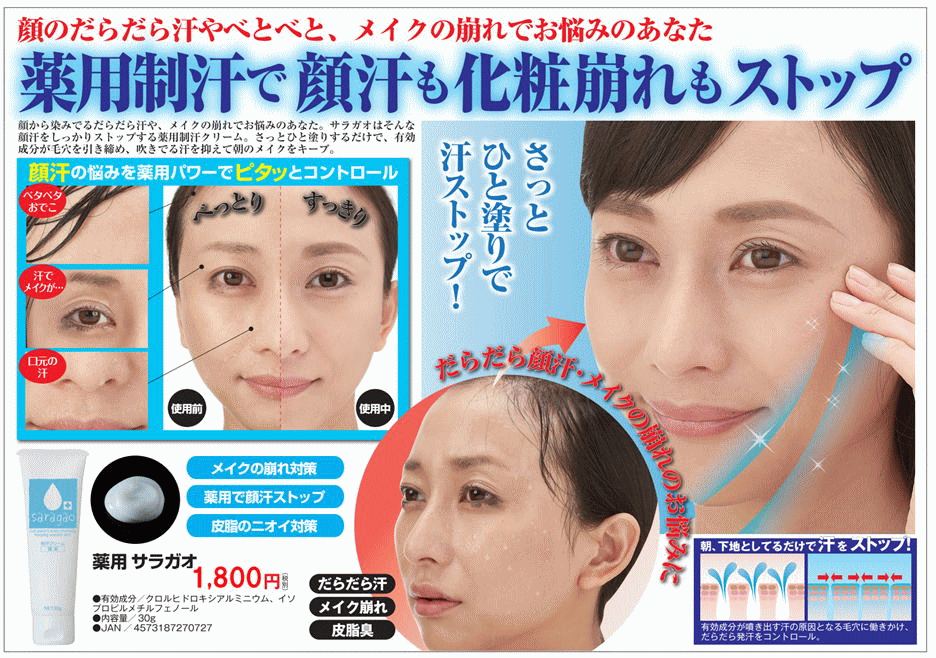 ・薬用サラガオ 30g ×6個セット販売 顔汗やメイク崩れが気になる方に、 顔の汗も抑える薬用制汗クリーム。