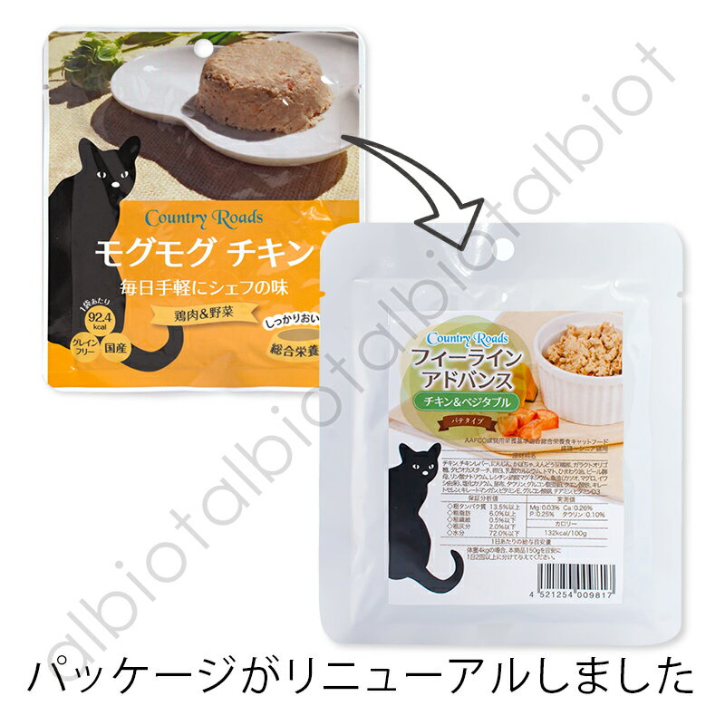 商品名 カントリーロードフィーラインアドバンスチキン&ベジタブル 70g(旧モグモグチキン) 原材料 チキン、チキンレバー、にんじん、かぼちゃ、えんどう豆繊維、ガラクトオリゴ糖、タピオカスターチ、卵白、乳酸カルシウム、トマト、ひまわり油、ビール酵母、リン酸ナトリウム、レシチン、硫酸マグネシウム、魚油(カツオ、マグロ、イワシ由来)、塩化カリウム、昆布、タウリン、グルコン酸亜鉛、クエン酸鉄、キレートセレン、キレートマンガン、ビタミンE、グルコン酸銅、チアミン、ビタミンD3 保証分析値 粗タンパク質 13.5%以上、粗脂肪 6%以上、粗繊維 0.5%以下、粗灰分 2.0%以下、水分 72.0%以下、マグネシウム 0.03%、カルシウム 0.25%、リン 0.25%、タウリン 0.10% カロリー 132 kcal / 100g 原産国 日本 対象年齢 成猫 - シニア猫 内容量 70g 製品情報 AAFCO栄養基準適合・総合栄養食 BHA・BHT・エトキシキン等の人工保存料や人工香料・人工着色料は一切使用しておりません。