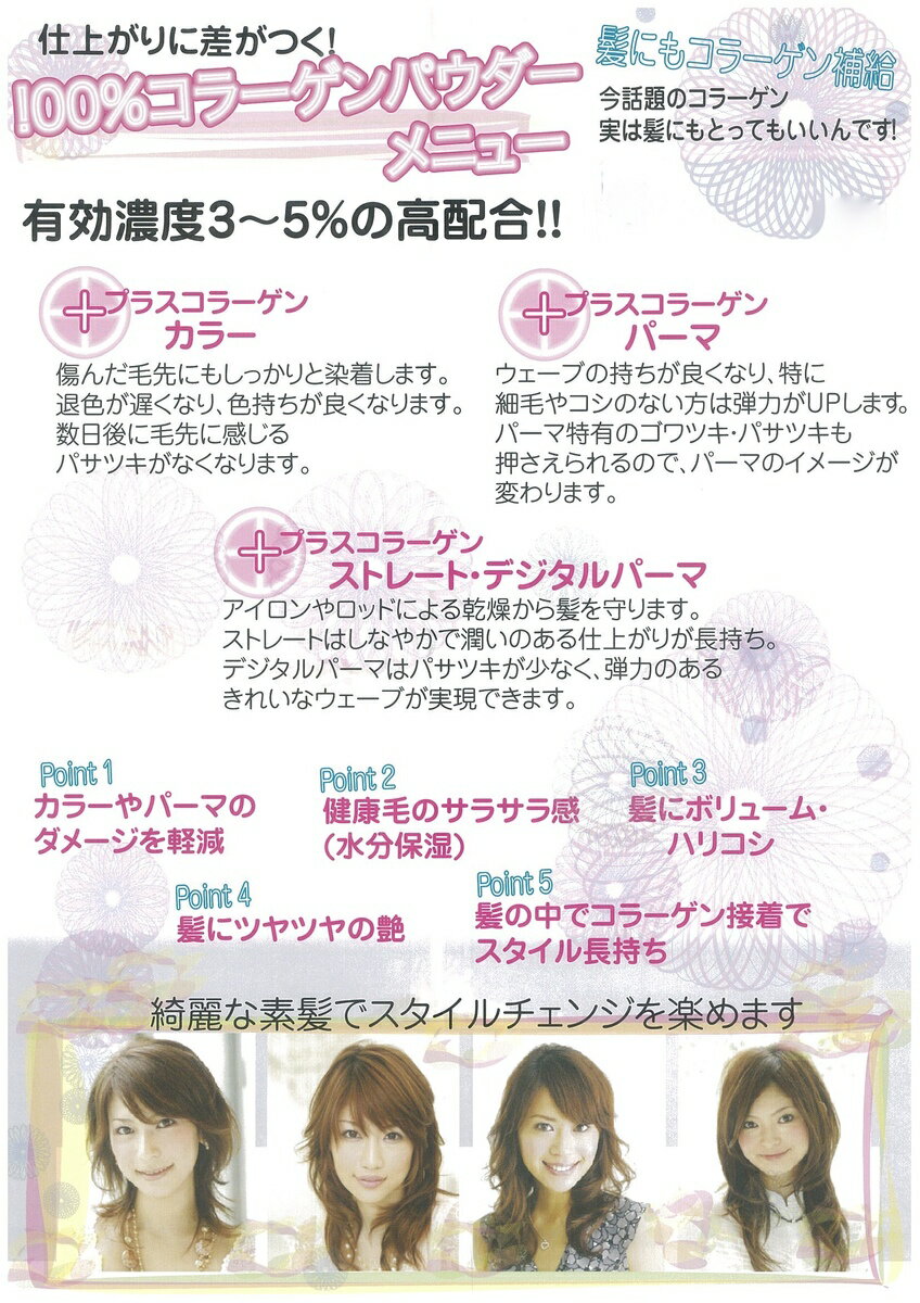 デジタルパーマの施術の場合は カップに1剤と2剤に このコラーゲン『小さじ1〜2杯か約3グラム位』 を半分ずつ混ぜる その場合コラーゲンは薬剤にすぐ馴染みますそして塗布します 時間は従来の時間で大丈夫ですコラーゲンPPTは、コラーゲンペプチドで、防腐剤などは含まれておりません。