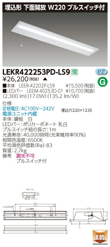【最安値挑戦中!最大25倍】東芝 LEKR422253PD-LS9 ベースライト TENQOO埋込40形 下面開放 W220 LED(昼光色) 電源ユニット内蔵 非調光 受注生産品 [§]